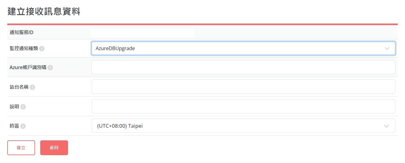 設定值 說明 Azure帳戶識別碼 監測服務的Azure訂閱識別碼 站台名稱 Azure SQL Server 名稱+Azure Database名稱(EX: ServernameDBname) 說明 說明此訊息項目的目的,此值會顯示在通知中