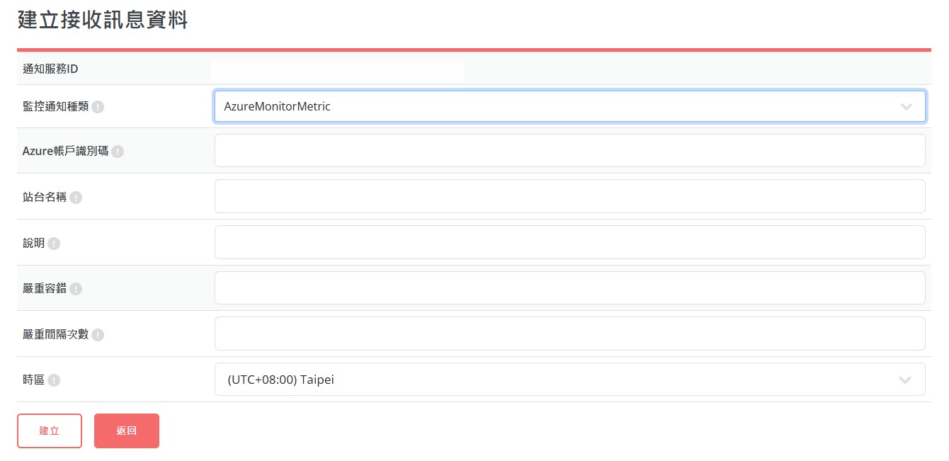 設定值 說明 Azure帳戶識別碼 監測服務的Azure訂閱識別碼 站台名稱 Azure資源名稱(EX: Azure Database名稱) 說明 說明此訊息項目的目的,此值會顯示在通知中 警告容錯數 若發送為警告狀態,此值為其容錯數(詳細說明請參考功能說明) 警告訊息間隔發送數 連續發送警告訊息時,其間隔次數(詳細說明請參考功能說明)