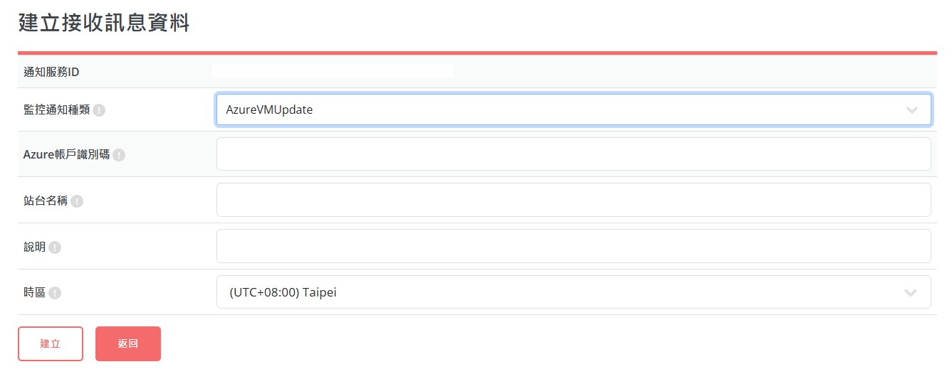 設定值 說明 Azure帳戶識別碼 監測服務的Azure訂閱識別碼 站台名稱 Azure VM名稱 說明 說明此訊息項目的目的,此值會顯示在通知中