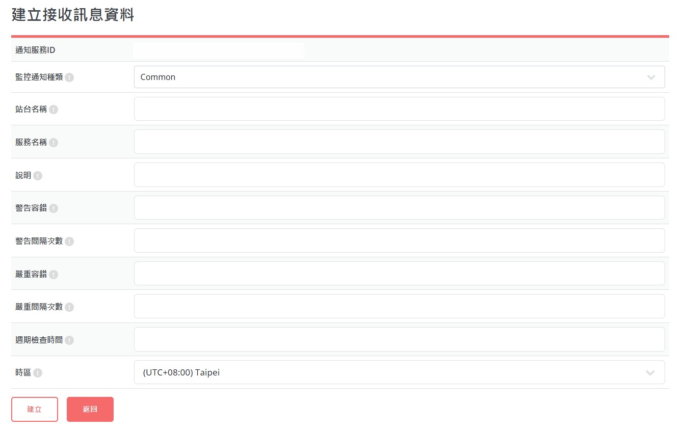 設定值 說明 站台名稱 對應Web API欄位的"Host",建議設定為主機名稱 服務名稱 對應Web API欄位的"Service",建議設定為該監控或服務名稱 說明 說明此訊息項目的目的,此值會顯示在通知中 警告容錯數 若發送為警告狀態,此值為其容錯數(詳細說明請參考功能說明) 警告訊息間隔發送數 連續發送警告訊息時,其間隔次數(詳細說明請參考功能說明) 嚴重容錯數 若發送為嚴重狀態,此值為其容錯數(詳細說明請參考功能說明) 嚴重訊息間隔發送數 連續發送嚴重訊息時,其間隔次數(詳細說明請參考功能說明) 周期檢查時間 設定訊息接收的容錯時間(詳細說明請參考功能說明) -
