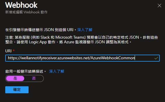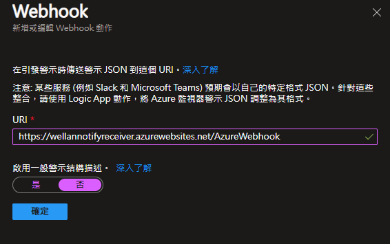 | Azure Monitor Metric(非一般結構描述) | https://wellannotifyreceiver.azurewebsites.net/AzureWebhook/v2/{SubscriptionID}/{Secret} |